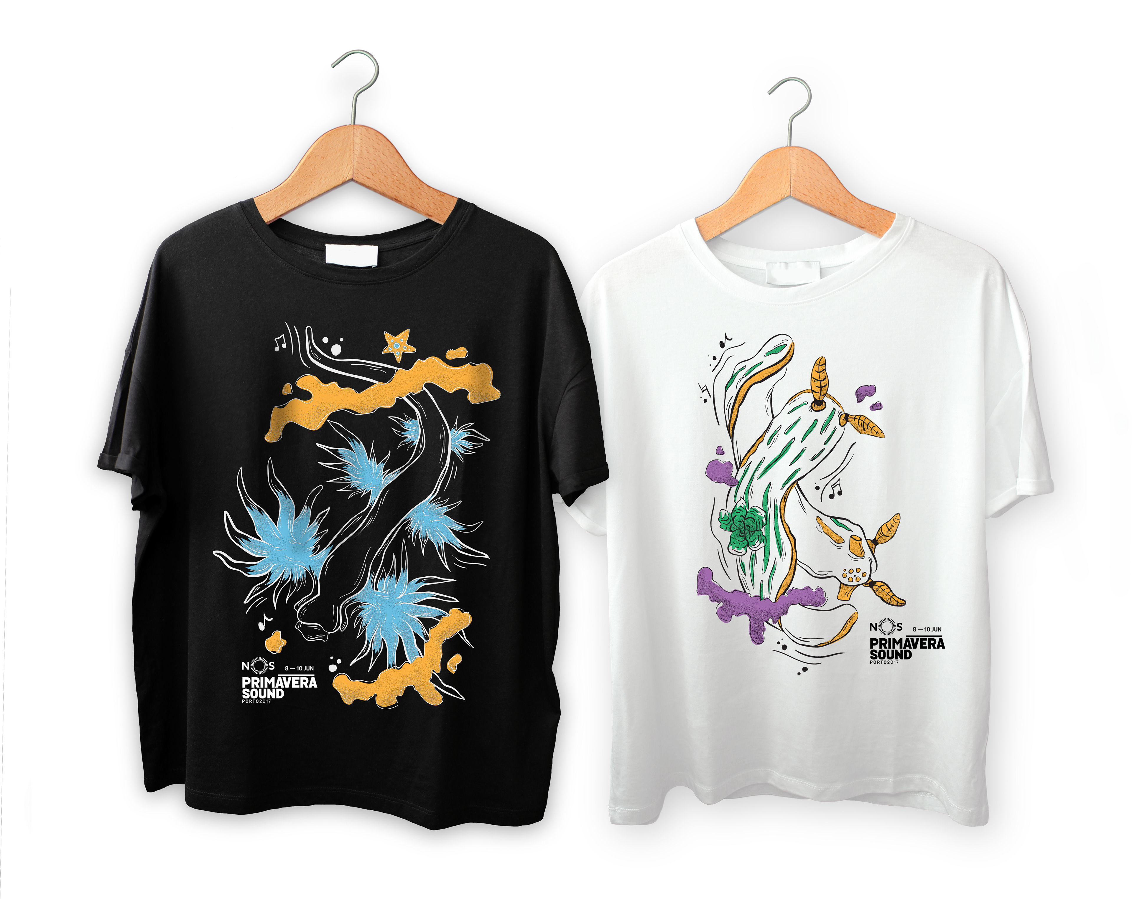 As part of NOS Primavera Sound, Atelier Primavera was created with the intent of developing a set of illustrations to be printed in merchandising pieces inspired by the concept of the 2017 edition of the festival. These illustrations were based on Nudibranchs, a group of soft-bodied marine gastropod molluscs noted for theis extraordinary colours and striking forms which are sometimes nicknamed as "clowns", "splendid", "dancers" and "dragons".